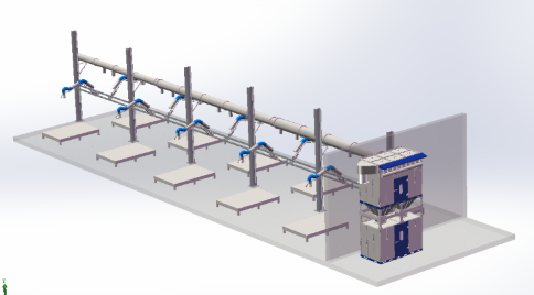 在涂裝生產(chǎn)線現(xiàn)場分散布置有5套廢溶劑收集裝置,1套分布于中涂線(包括8臺機(jī)器人和10個手工噴漆點(diǎn)),2套分布于面漆色漆線(包括8臺機(jī)器人和16個手工噴漆點(diǎn))